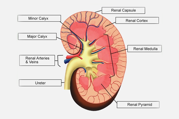 The first part of the renal pelvis contains the calyces. These are small cup-shaped spaces that collect fluid before it moves into the bladder.